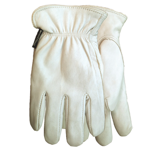 3M Thinsulate C100 lining, full-grain goatskin leather, drivers style with keystone thumb, shirred elastic wrist, slip-on style cuff